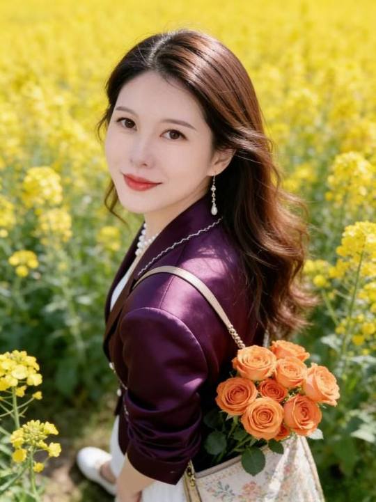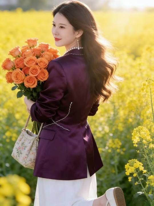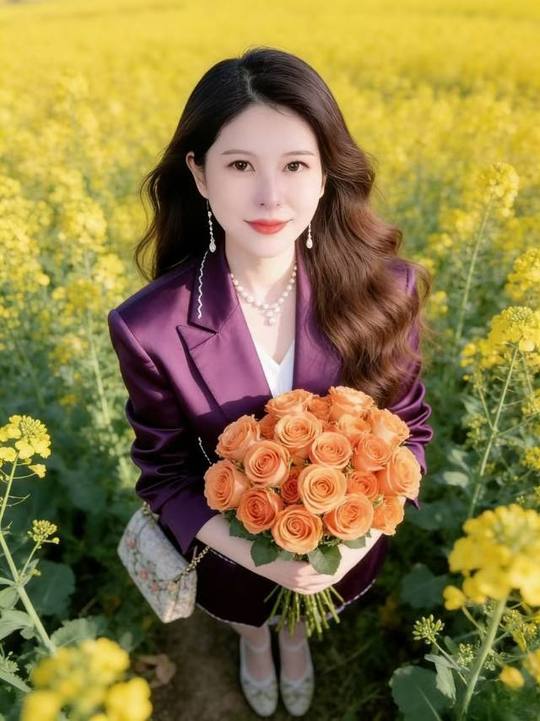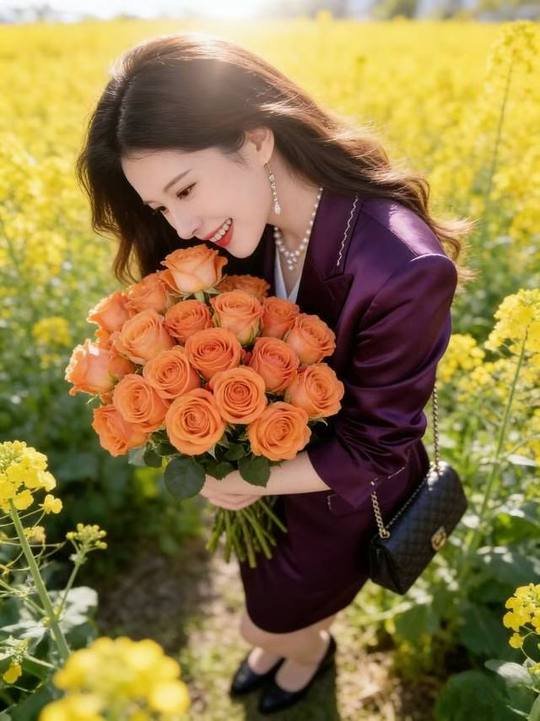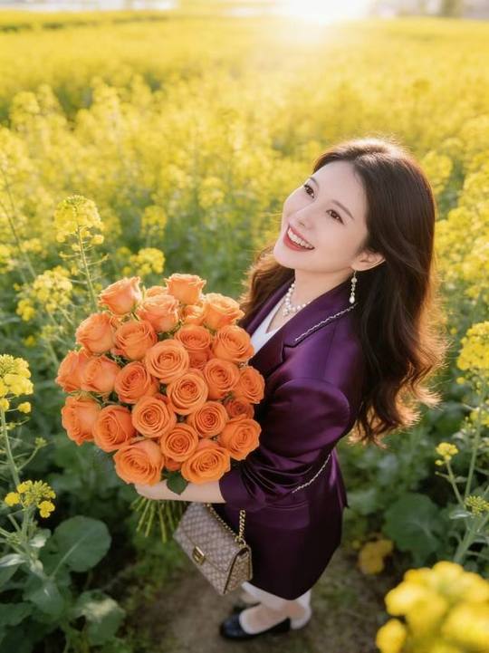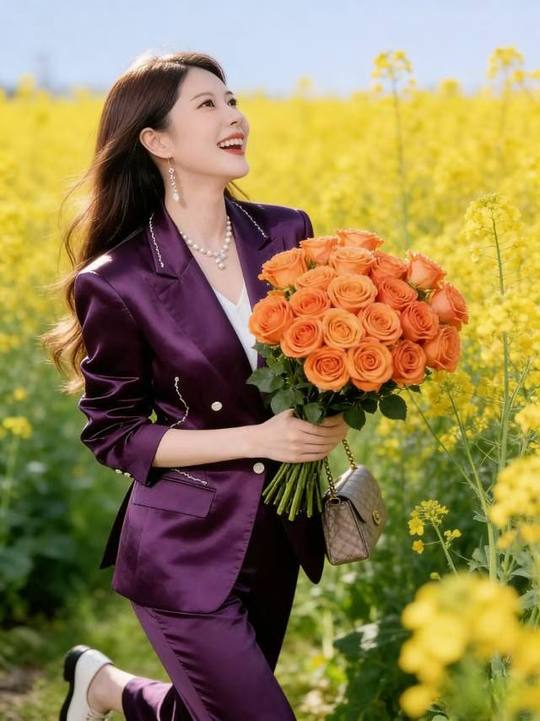 👑在金黄的花海里奔跑,连风都是甜的🍃 紫色西装撞上橘色玫瑰,是春天最亮眼的配色 AI摄影=低投入+高回报! 不用囤货、不用技术,春日写.真爆.款不断,带你轻松入局赚米🚀