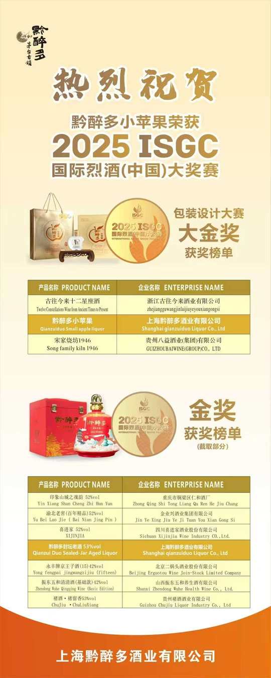双喜临门。[庆祝] 热烈㊗️贺【黔醉多小苹果】荣获2025年ISGC国际烈酒(中国)大奖赛 包装设计大赛 大金奖。 热烈㊗️贺【黔醉多封坛老酒】荣获2025年ISGC国际烈酒(中国)大奖赛 金奖。