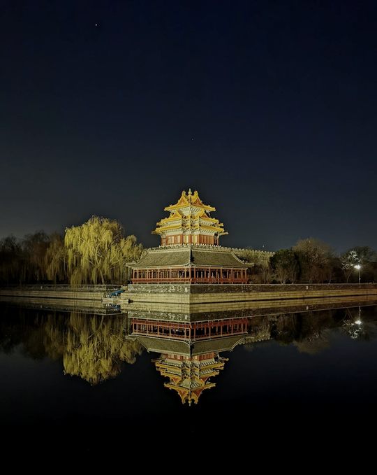 故宫东北角楼下,曾经是我工作的地方。今天在这里可以欣赏 木星(左上角)与土星(角楼顶)与金星(右城墙顶)连成一线!星辰大海,气象万千! 2021年12月4日