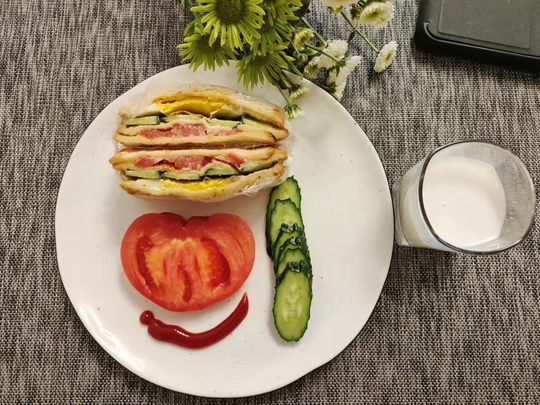 营养早餐开启美好的一天✊✊✊ 一份蛋白:鸡蛋 牛奶 一份蔬菜:西红柿 黄瓜 一份主食:面包片