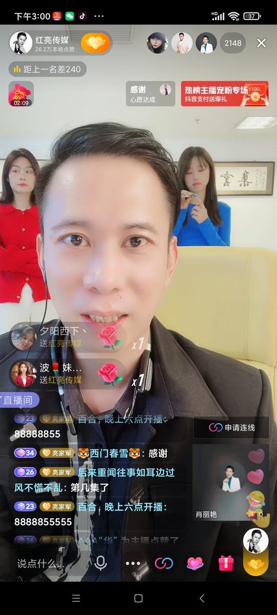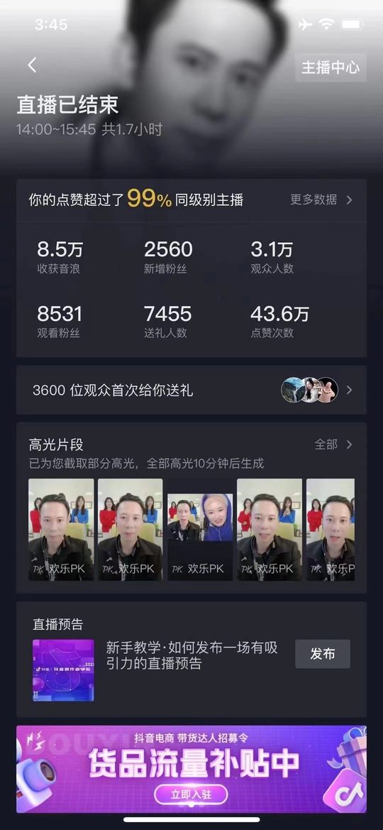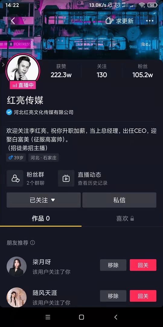 社博创始人李红亮老师今天在抖音首播1.7个小时,涨粉2560个,送礼人数7455个[666][666][666],粉丝总数105万!