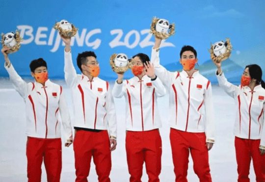 祝贺中国队在首都体育馆举行的北京2022年2月5日冬奥会短道速滑项目混合团体接力决赛中夺得冠军。这是中国代表团在本届冬奥会中获得的第1枚金牌。