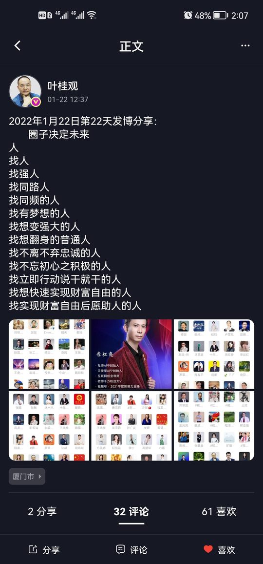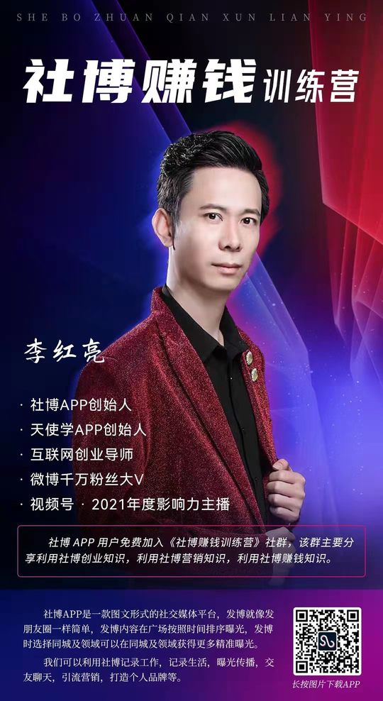 2022年1月15号第15天发博分享: 社博的 流量大于任何人的朋友圈,只要你发博看到的用户绝对比你朋友圈大,朋友圈好友有限,社博用户无上限。 ———李红亮
