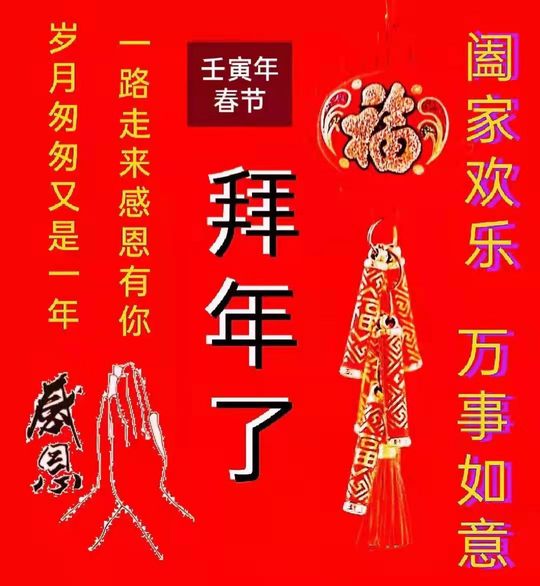 虎年 新年开泰 正月初一向大家拜年。 阖家健康,龙腾虎跃。事业辉煌, 虎虎生威。生活美满,瑞虎送财。 聚会观景,生龙活虎。银发添喜, 春色增寿。虎年吉祥,事事如意。