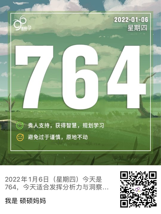 2022年1月6日(星期四)今天是764,今天适合发挥分析力与洞察力,做学习与规划,会遇到贵人支持,获得有价值的智慧或经验,让你认知思维发生变化。多出去与人分享,把计划好的方案落地实施,才能拿到结果。注意不要过于谨小慎微,担心风险而停留在原地不动。