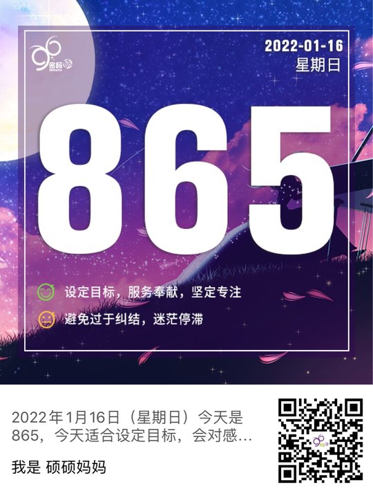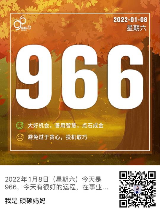 2022年1月8日(星期六)今天是966,今天有很好的运程,在事业或投资上,运用一点小智慧,稍微努力一下就有不错的回报,可谓点石成金。注意不要想太多,什么都想要追求完美,学会适度地放宽标准,活在当下,接受现实,放下评断,耐心等待,才能让价值最大化。