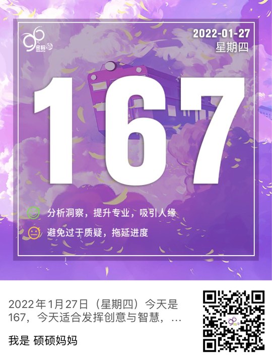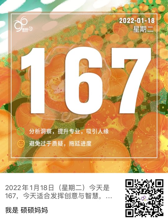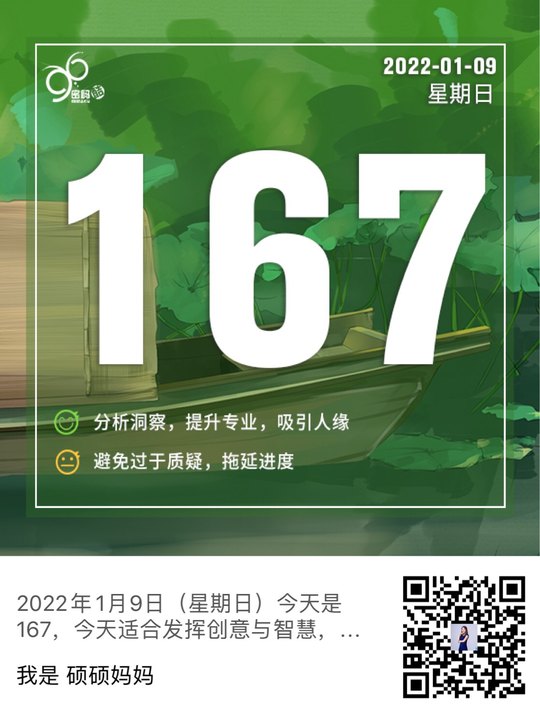 2022年1月9日(星期日)今天是167,今天适合发挥创意与智慧,有较强的分析能力,善于解决问题;提升专业能力可以为你增值吸引好人缘。注意不要过于以自我为中心,为了追求完美迟迟不去行动,也不要过度质疑,为了探究细节拖延进度。