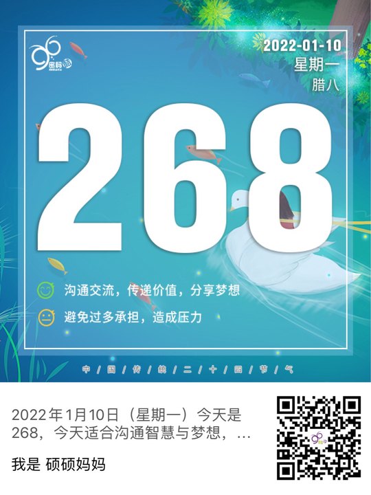 2022年1月10日(星期一)今天是268,今天适合沟通智慧与梦想,与人合作,传达价值与使命,会给你带来不错的人脉关系,获得较多的财富。会比较感性、敏感,为别人着想,注意不要委曲求全,为了面子不服输而过多的承担,造成不必要的压力。