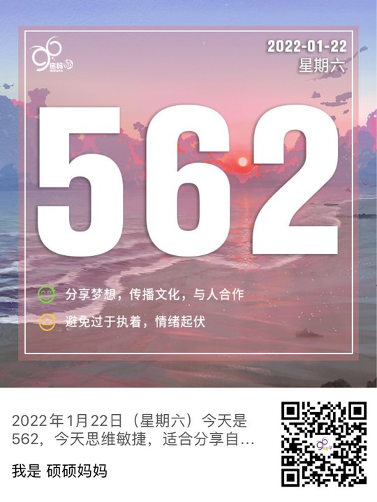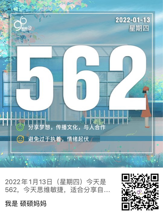 2022年1月13日(星期四)今天是562,今天思维敏捷,适合分享自己的梦想和智慧,多与人交流沟通,传播文化与价值。会特别小心谨慎,尤其在使用金钱方面,不会冒险投资。注意不要过于执着和吹毛求疵,否则内心拉扯,情绪容易起伏阴晴不定,会感到闹心。