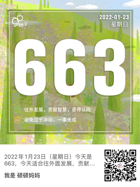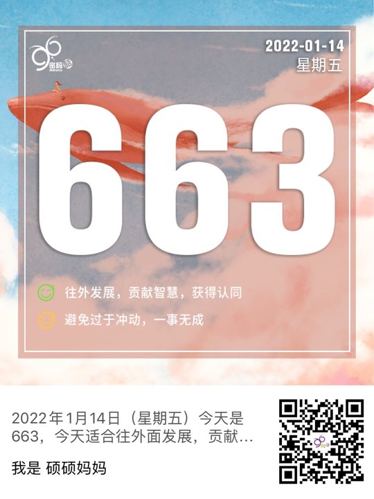 2022年1月14日(星期五)今天是663,今天适合往外面发展,贡献自己的智慧,有舍才有得,可以获得更多的机会与认同。注意不要过于冲动,机会很多但不能什么都想要,否则就会瞎忙而一事无成,切忌为了获取更多的财富而抱有赌徒心态,小心后果不堪设想。