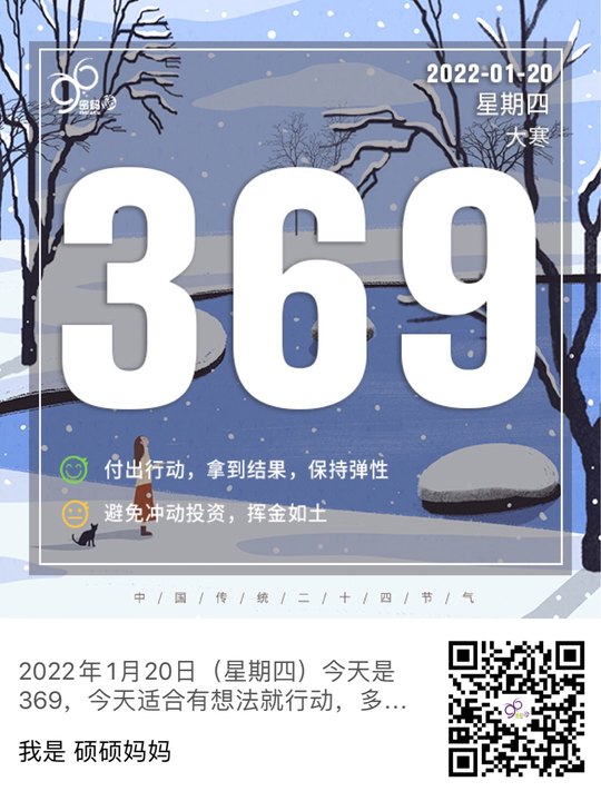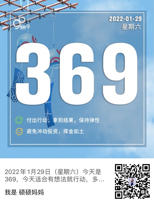 2022年1月11日(星期二)今天是369,今天适合有想法就行动,多付出才能拿到想要的结果,可以边做边调整,保持弹性,带来更多的机会与认同,适当的投资可以创造更大的财富。注意不要冲动,想的太多什么都想要,不要想着赚快钱和做风险大的投资,否则就会挥金如土。