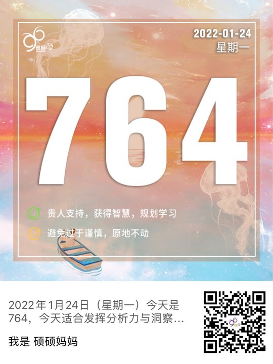 2022年1月15日(星期六)今天是764,今天适合发挥分析力与洞察力,做学习与规划,会遇到贵人支持,获得有价值的智慧或经验,让你认知思维发生变化。多出去与人分享,把计划好的方案落地实施,才能拿到结果。注意不要过于谨小慎微,担心风险而停留在原地不动。