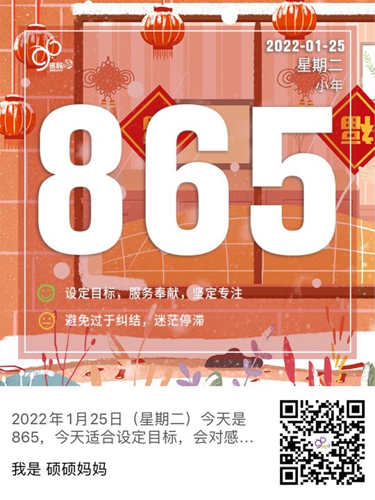 2022年1月7日(星期五)今天是865,今天适合设定目标,会对感兴趣的事情深入研究,一旦定下目标要投入精力,专注执行,坚定地前进,并且多付出,有服务奉献的精神。注意不要钻牛角尖,过于纠结,为了自己的感觉而抱怨,只会让自己更不舒服,更加迷茫而停滞不前。