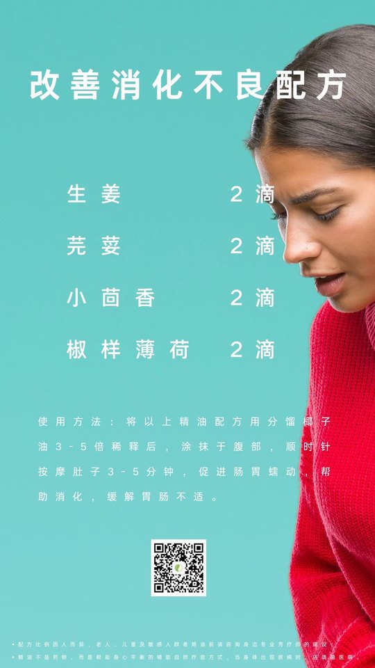 💦改善消化不良配方 肠胃“闹脾气”,精油来帮忙! 新春佳节,餐桌上总少不了各式美味佳肴的诱惑,吃多了难免会引起消化不良、胀气等肠胃问题。肠胃“闹脾气”了怎么办?快来试试下面这个芳疗配方吧,用精油帮助缓解消化不良,呵护胃肠健康!