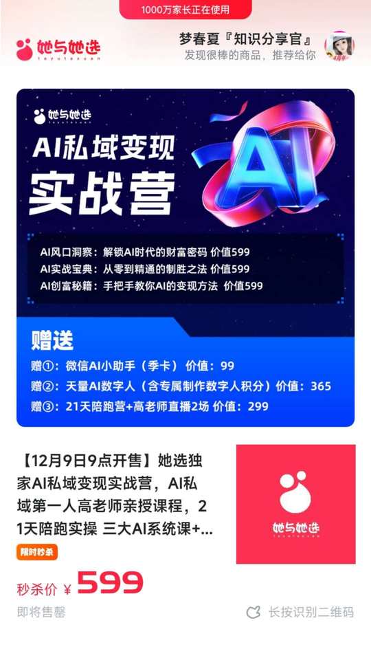 她选独家[爱心]AI私域实战营已开售🔥