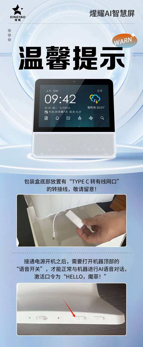 @所有人 [憨笑]开箱温馨提示[憨笑] [烟花]煋耀AI智慧屏首发爆单![庆祝] [耶]开箱体验,敬请留意—— [机智]1. 包装盒底部放置有“Type C 转 有线网口”的转接线,敬请留意! [666]2. 接通电源开机之后,需要打开机器顶部的“语音开关”,才能正常与机器进行AI语音对话,激活口令为“HELLO,魔菲!”