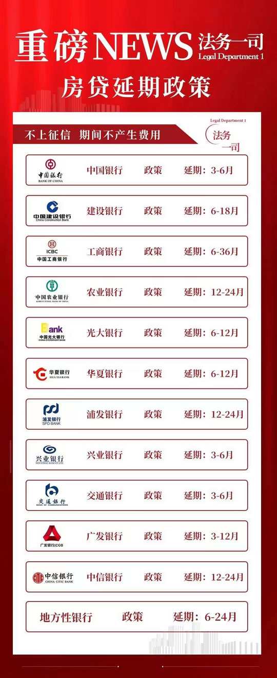 [爱心]今日分享|法务一司🎉 各大银行房贷🉑延期政策来啦❗ 不上征信 期间不产生费用❗ 月供压力大的速来❗ 我们帮您减轻压力❗ 全国接单🤝