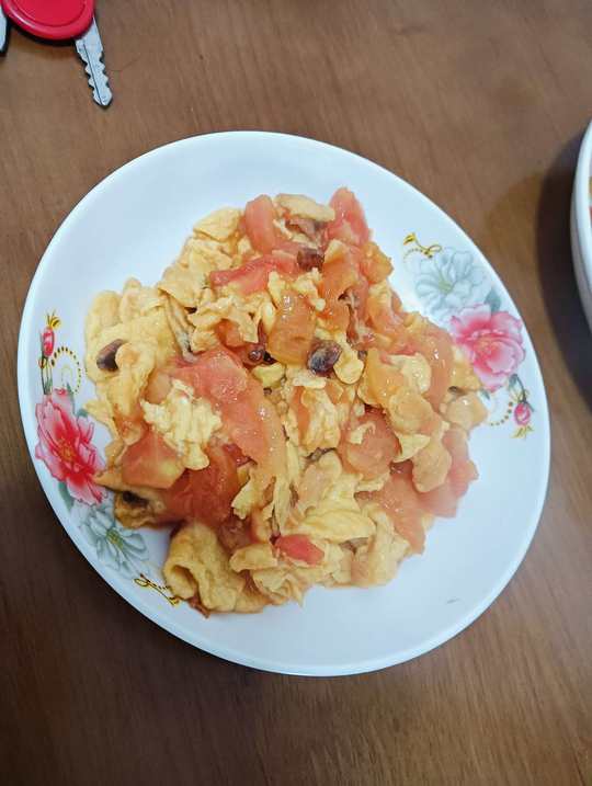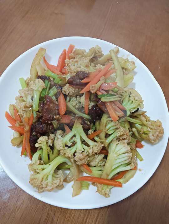20251219今天自己下厨🍝冒似炒的蕃茄🍅炒蛋🥚放错调料了,又咸又甜没酸😃😃不过花菜炒的下饭,多吃了两碗🍚😃😃