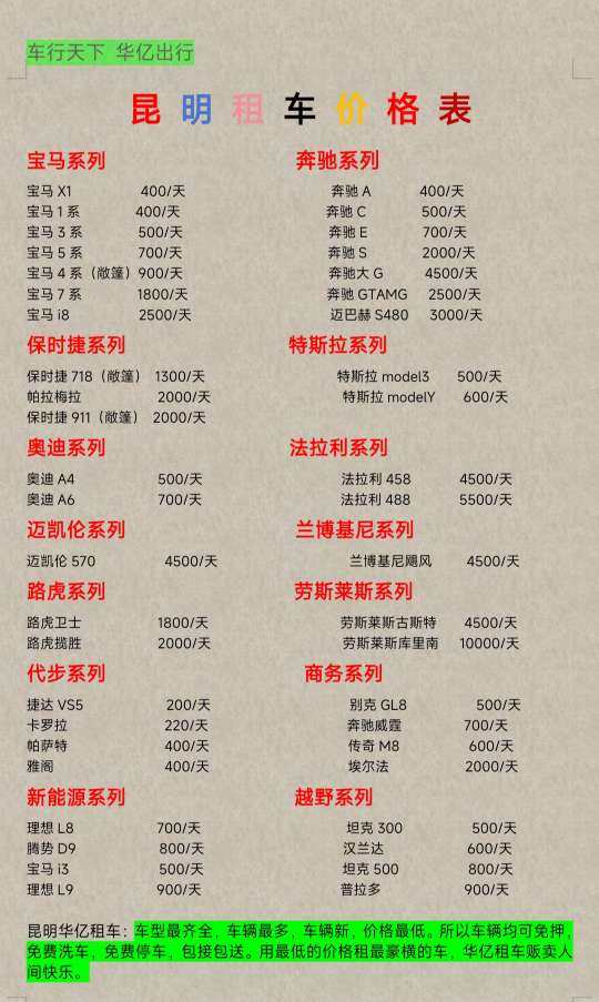 汽车租赁价格参考表,需要租车用车的call我