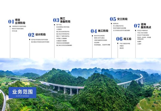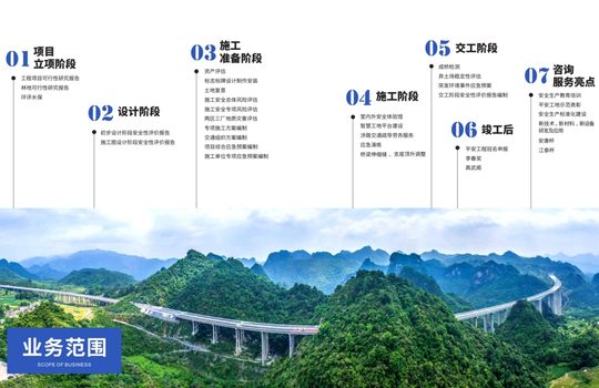 承接全国高等级公路、铁路 初设阶段、施工图设计阶段安全性评价报告; 施工安全风险评估;两区三厂地质灾害评估; 专项施工方案编制;交通组织方案编制;项目综合应急预案编制;施工单位专项应急预案编制;室内外安全体验馆;智慧工地平台建设;涉路交通疏导劳务服务;弃土场稳定性评估;突发环境事件应急预案;交工阶段安全性评价报告编制。