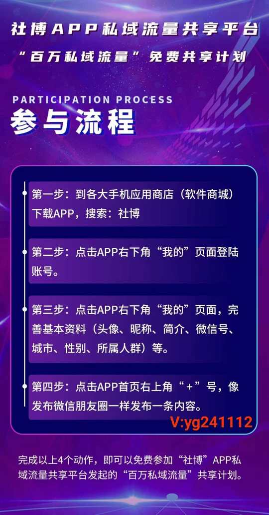 我在参与“社博”APP私域流量共享平台,免费发起的“百万私域流量”共享计划。[庆祝][庆祝][庆祝] 任何人免费参与共享以下9大人群的私域流量: 1、创始人 2、创业者 3、团队长 4、培训师 5、个体户 6、推销员 7、大学生 8、上班族 9、老板 只要完成海报上的四步,就可以免费参与“百万私域流量”共享计划。[强] 完成后截图发给我,我来免费邀请您进入“社博私域运营总裁班”社群,免费学习私域流量运营。