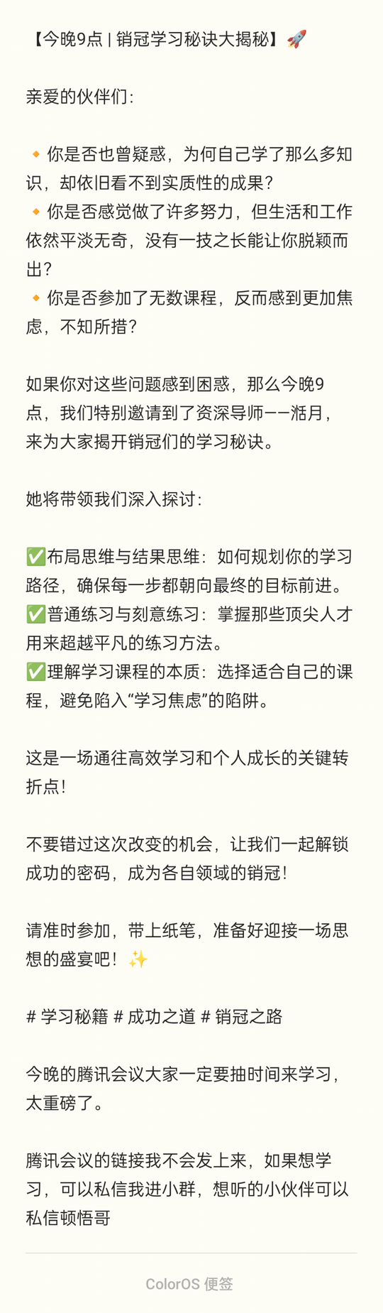 【今晚9点 | 销冠学习秘诀大揭秘】🚀 亲爱的伙伴们: 🔸你是否也曾疑惑,为何自己学了那么多知识,却依旧看不到实质性的成果? 🔸你是否感觉做了许多努力,但生活和工作依然平淡无奇,没有一技之长能让你脱颖而出? 🔸你是否参加了无数课程,反而感到更加焦虑,不知所措?