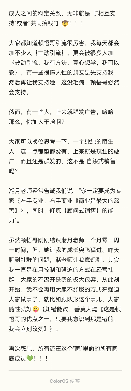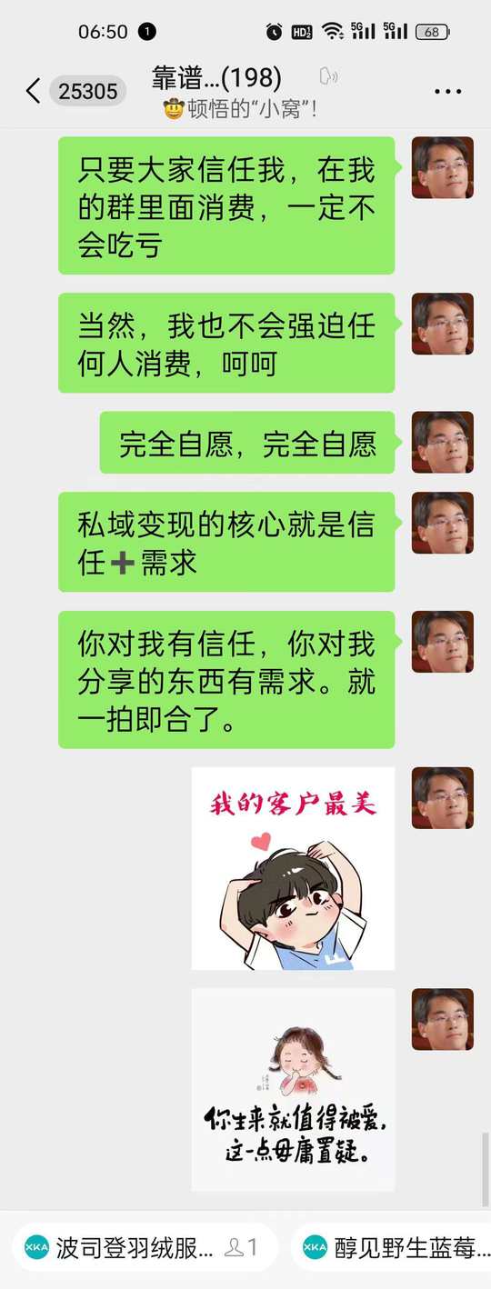 成人之间的稳定关系,无非就是〖“相互支持”或者“共同搞钱”〗🤠!!! 大家都知道顿悟哥引流很厉害,我每天都会加不少人{主动引流},更会被很多人加{被动引流,我有方法,真心想学,我可以教},有一些很懂人性的朋友是先支持我,然后再让我支持她,这没毛病,顿悟哥必然会支持。 然而,有一些人,上来就群发广告,哈哈,那么,你加人干啥啊?