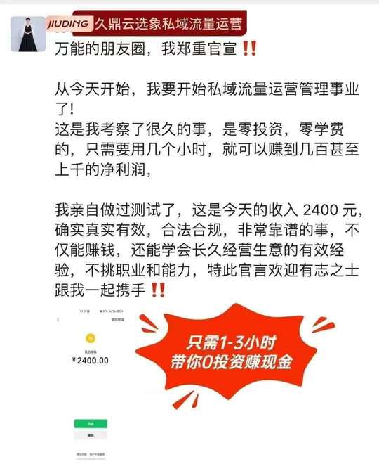 久鼎私域流量变现金牌教练 站在未来看现在 久鼎私域流量变现金牌教练 免费带人微信赚米 关键的关键: 全程: 0投资 0费用 0风险 让我们在1~3个小时变现3~5位数 太阳每天都是新的 对的时间遇到对的人 一切都是最好的安排 我们又见面了!