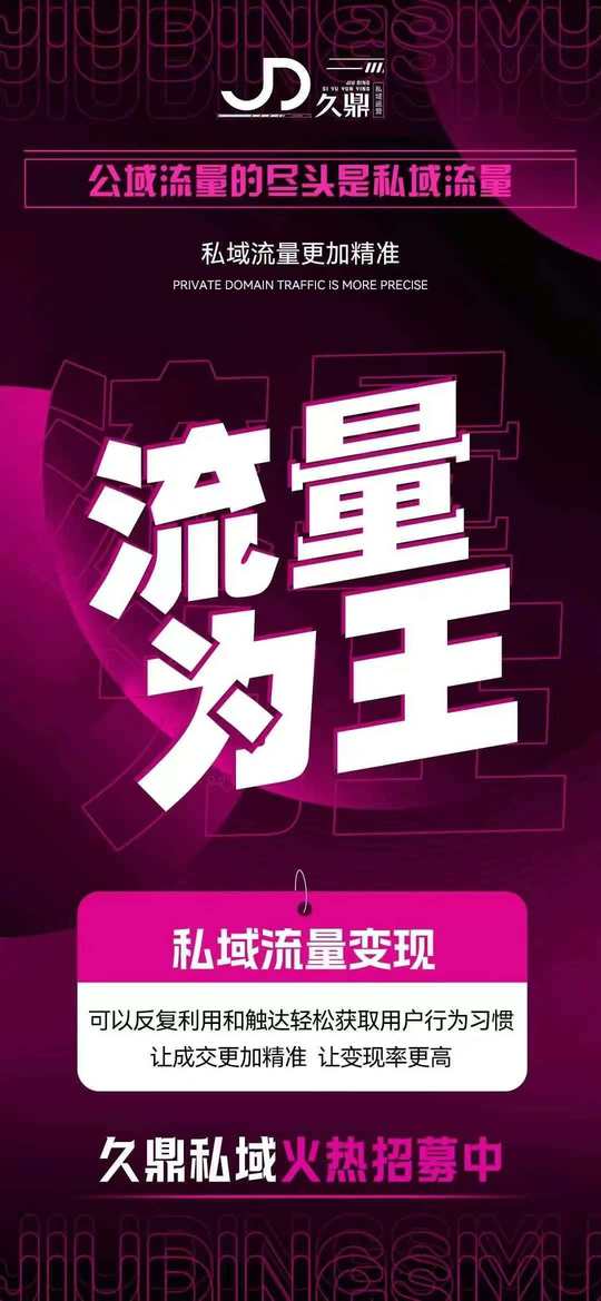 公域流量的尽头是私域流量 私域流量更加精准 私域流量变现[得意] 可以反复利用和触达轻松获取用户行为习惯 让成交更加精准让变现率更高[强] 久鼎私域 火热招募中