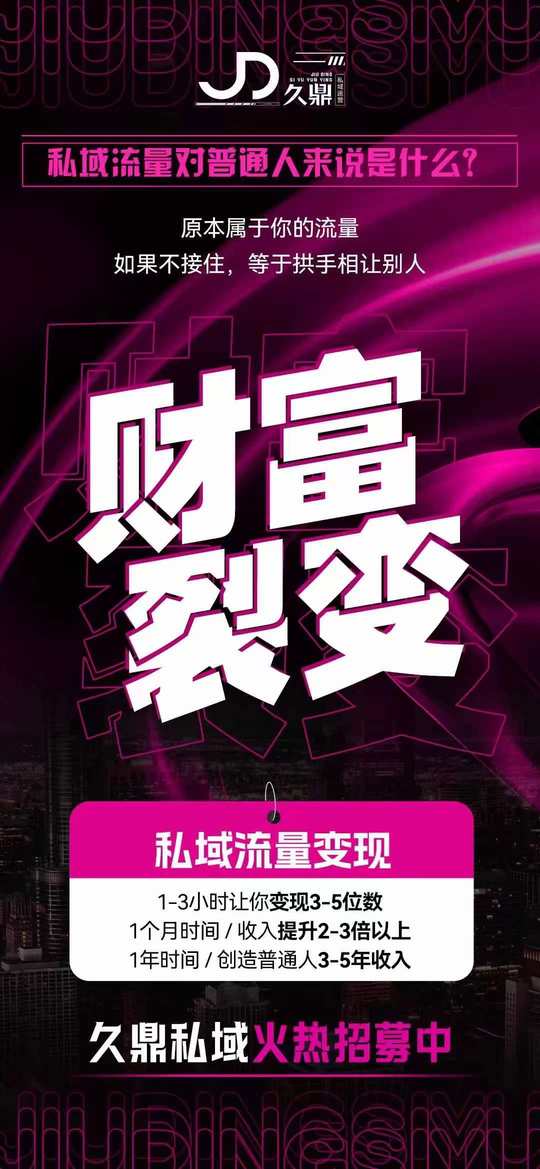 私域流量对普通人来说是什么❓ 原本属于你的流量 如果不接住,等于拱手相让别人[凋谢] 久鼎私域流量变现 1-3小时让你变现3-5位数[庆祝] 1个月时间/收入提升2-3倍以上1年时间/创造普通人3-5年收入从此实现财富裂变