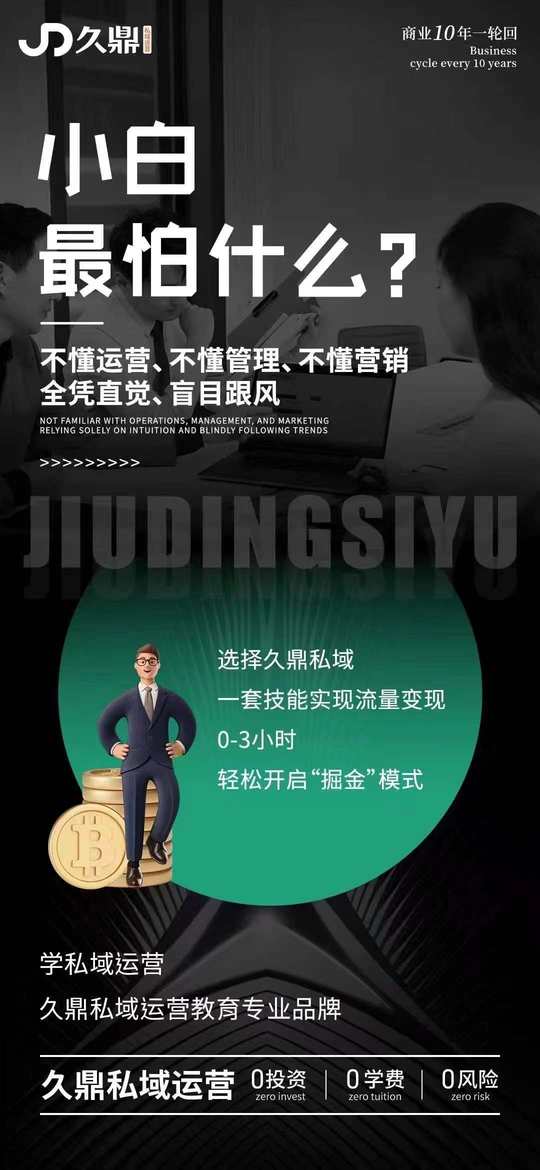 小白最怕什么❓ 不懂运营、不懂管理、 不懂营销全凭直觉、盲目跟风 🔻 选择久鼎私域 一套技能实现流量变现0-3小时 轻松开启“掘金”模式