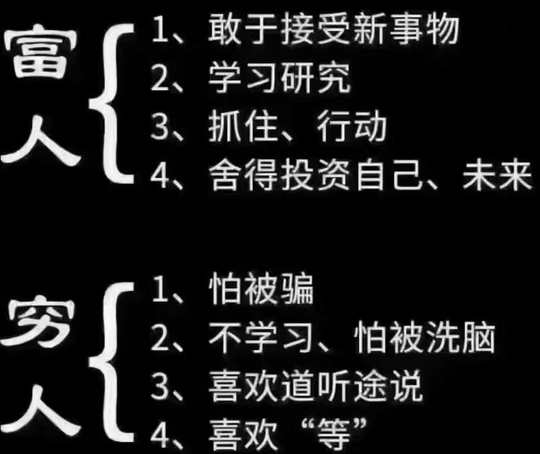 你发现了没有?---我们每个人都是以他的理解力和经历来建构自己的思维模式,然后再用这个思维模式去理解这个世界。所以,只有改变思维,才能改变我们理解这个世界的方式。 👉实财现务自由的人的思维方式,他的关注点不是用时间和技能去挣钱,而是我怎么通过建立一个系统或者拥有一个系统来赚到资产,或者是让钱为我工作。 👉这也是为什么我们说---从今天开始,你看的书、听的播音、你交往的人将决定你五年以后的生活。因为你看的书、听的播音和交往的人,会从根本上影响到你的思维。
