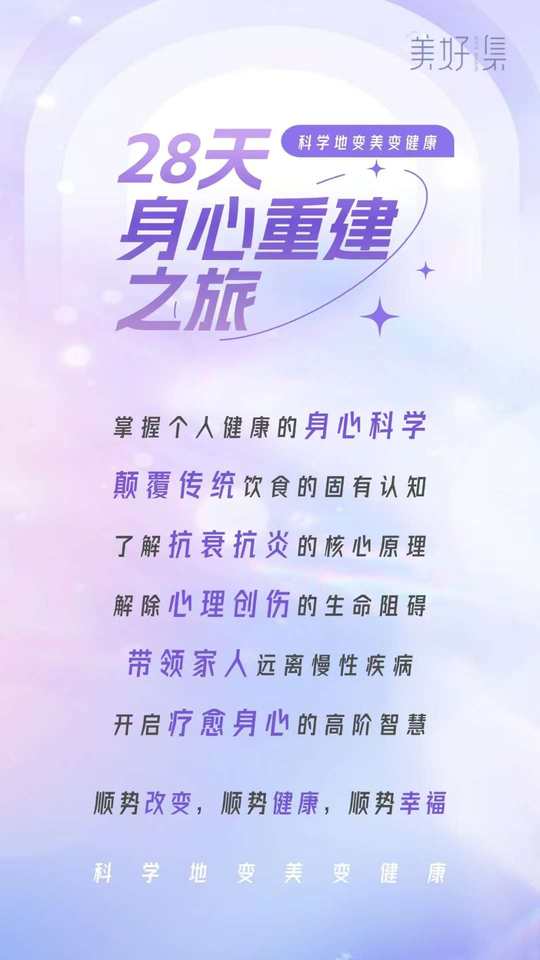 28天身心重建之旅,将从能量的角度全面升级你的生命状态,不仅让你的身体重获健康,更让你的心灵得到前所未有的滋养与释放。