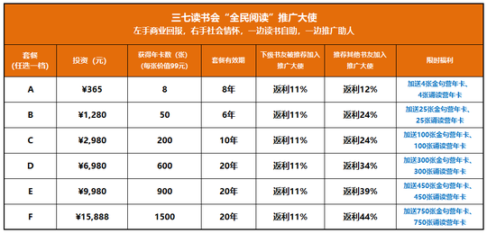 读书:三七读书会,付费6980元成为VIP推广大使,余生把读书和推广全民阅读作为自己的事业。