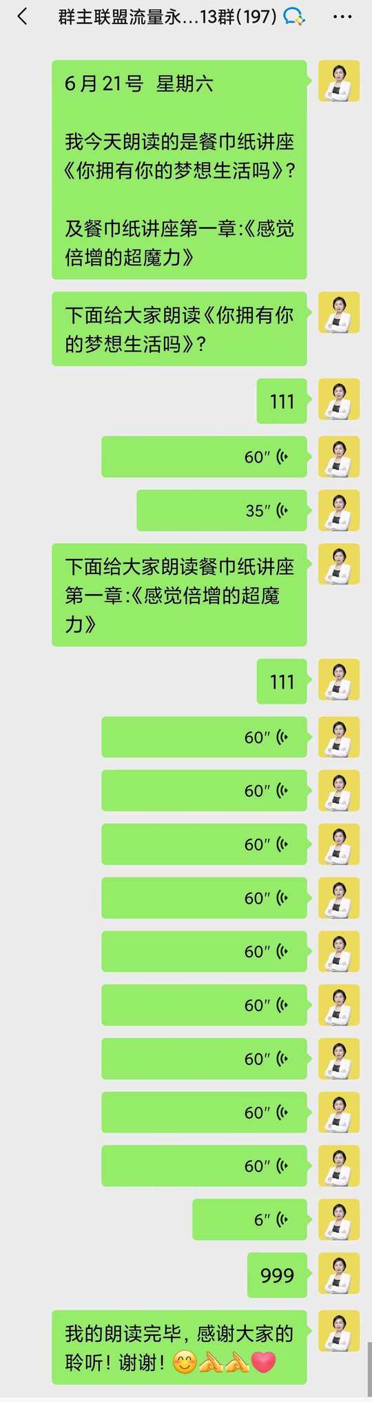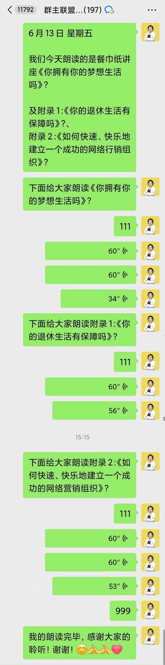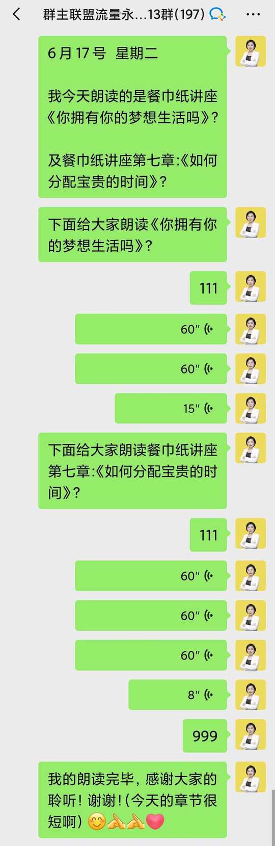 每天早上七点和教练一起晨读之后,再和伙伴们一起朗读: