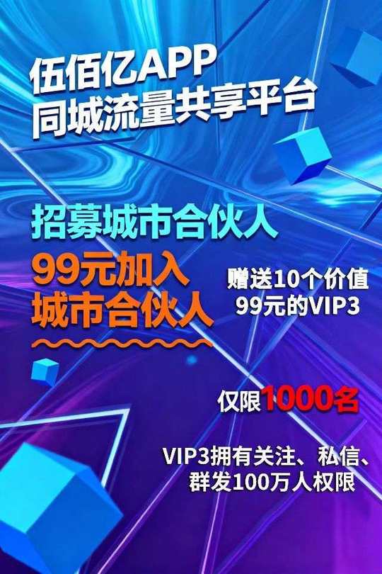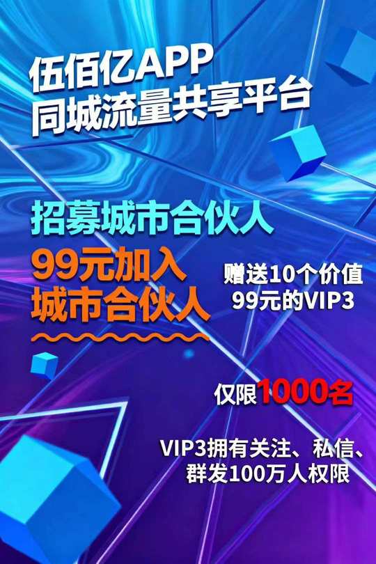 伍佰亿"APP同城流量共享平台,招募城市合伙人有意向的私信。