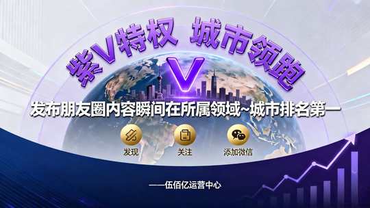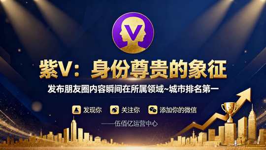 头像加紫V,代表着身份尊贵的象征,发布朋友圈内容瞬间在所属领域~城市排名第一,让更多用户发现你,关注你,添加你的微信 ———伍佰亿运营中心