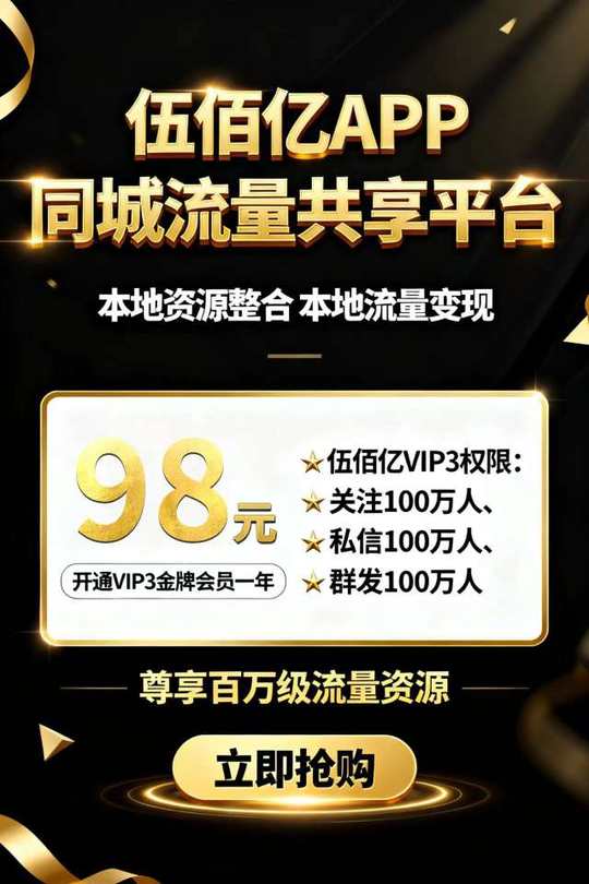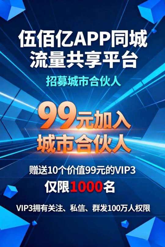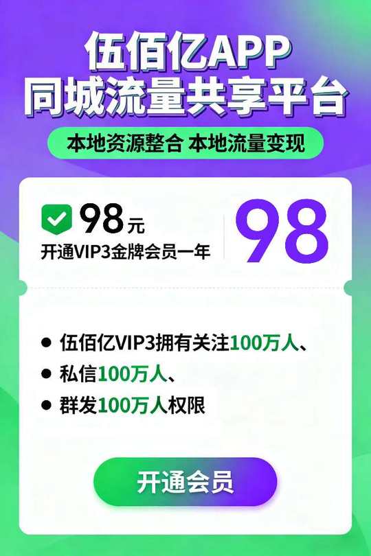 🔥 伍佰亿重磅升级!同城流量池全面开放,资源互通共赢本地市场! 仅需99元,抢占城市合伙人席位! 直接拿下1个VIP3+1个紫V超值组合,低成本撬动精准客流!