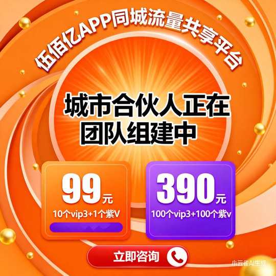 想拿下整座城市的客源?伍佰亿APP同城流量+人脉整合平台来了 招募城市合伙人,海量本地资源渠道全赠送 抢占本地流量红利,错过再无!