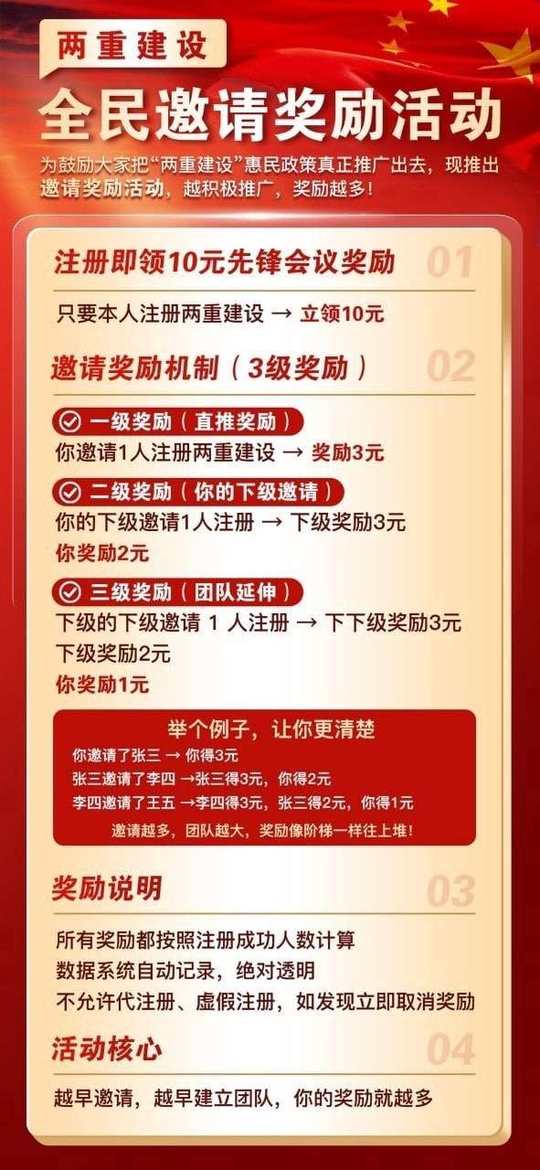 4125064 🌺🌺🍀🍀🍀🌺🌺🌺 🌺🌺🌺 两重建设推广奖励 🌹一级模范 团队:50人 直推:10人 月工资:1000 福 三甲医院基础体验一次(体检项目:血压、血糖、心电图、肝肾功能) 利 🌹二级模范 团队:150人 直推:30人 月工资:3000 .三甲医院体检升级 .可申请"团队聚餐补贴" ·授予"优秀团队组织者"荣誉证书 🌹三级模范 团队:450人 直推:60人 月工资:5000 .三甲医院体检升级 .可申请"团队聚餐补贴" ·授予"优秀团队组织者"荣誉证书 🌹 四级模范 团队:1000人 直推:100人 月工资:15000 .三甲医院全面体检 福 .可申请团队聚餐可申请开设"地区服务办公室.全国红色旅游补贴 利 .授予"地区建设先锋官"荣誉 🌹五级模范 团队:3000人 自推:200人 月工资:30000 ◇全国红色旅游专车接送 .三甲医院全身精密体检(含脑部、肿瘤筛查)·授予"地区建设特派官"官方荣誉称号.家电大礼包(冰箱、洗衣机、电视机三件套) 利 🌺团队奖励 一代:A15% 二代:B7% 三代:C3% 🌺先锋团队长邀请奖励